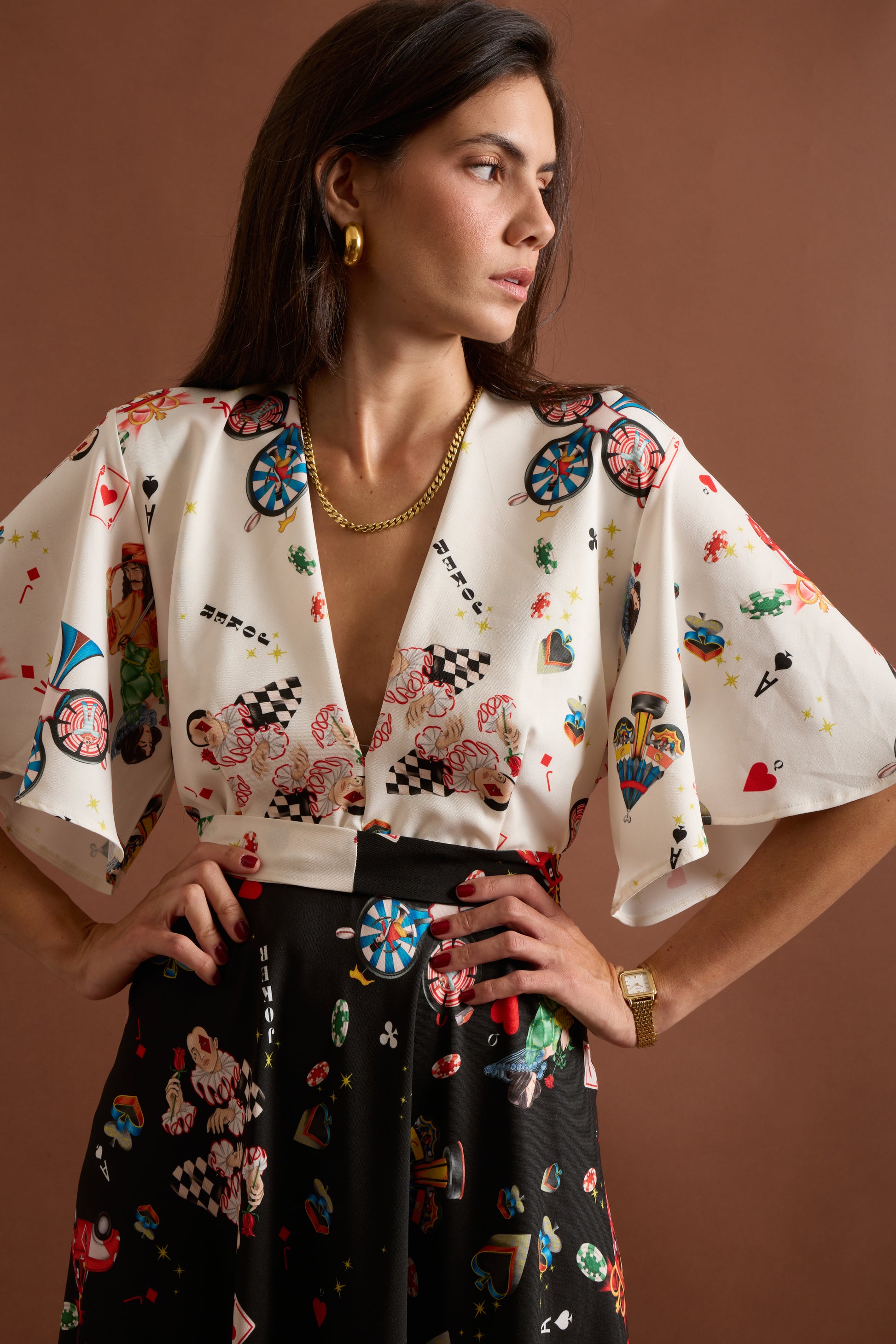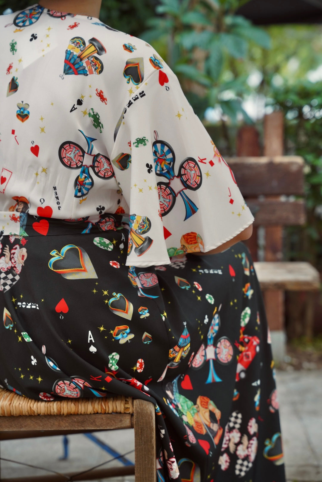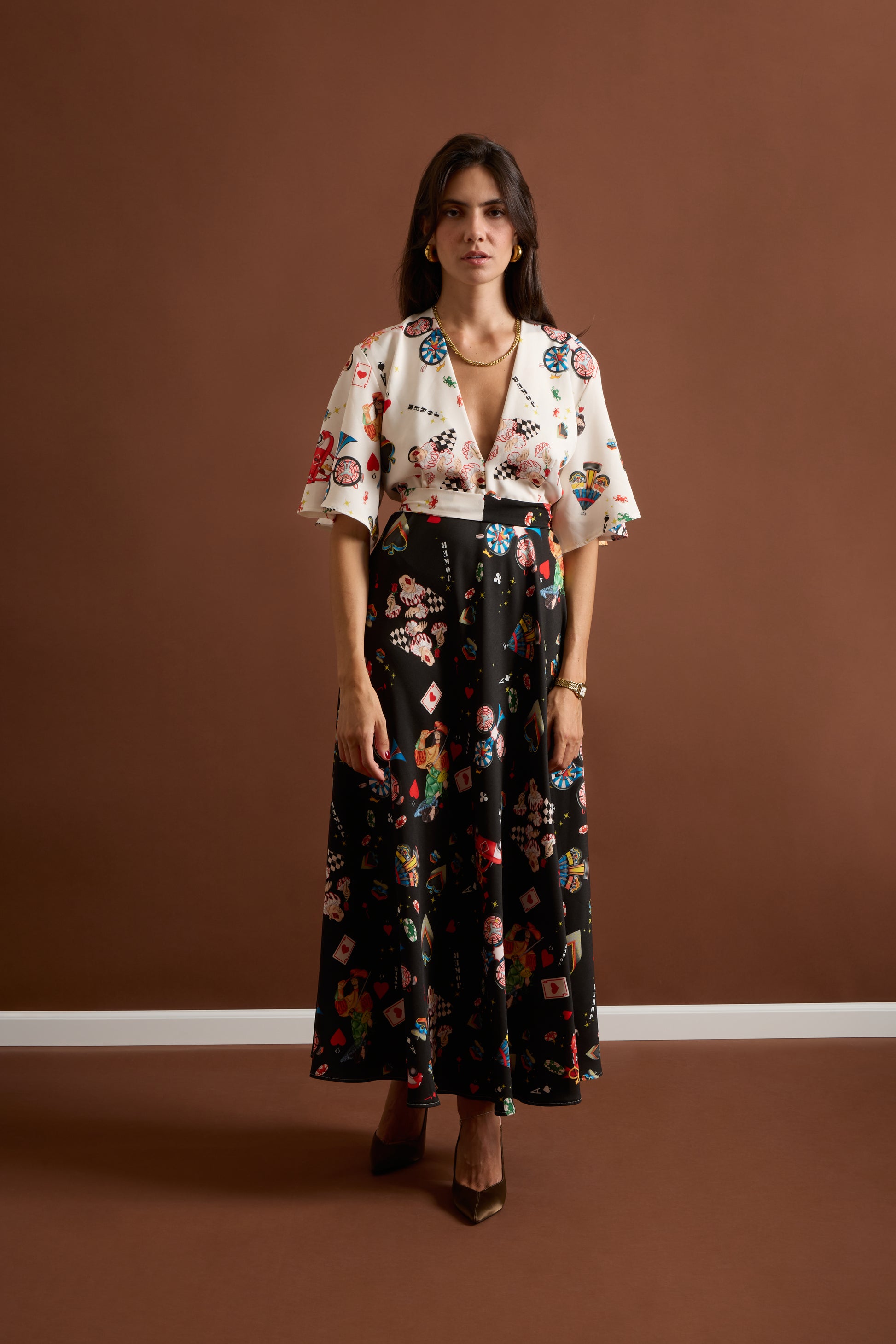 - Contrasting print: ivory upper & black skirt with playful motifs