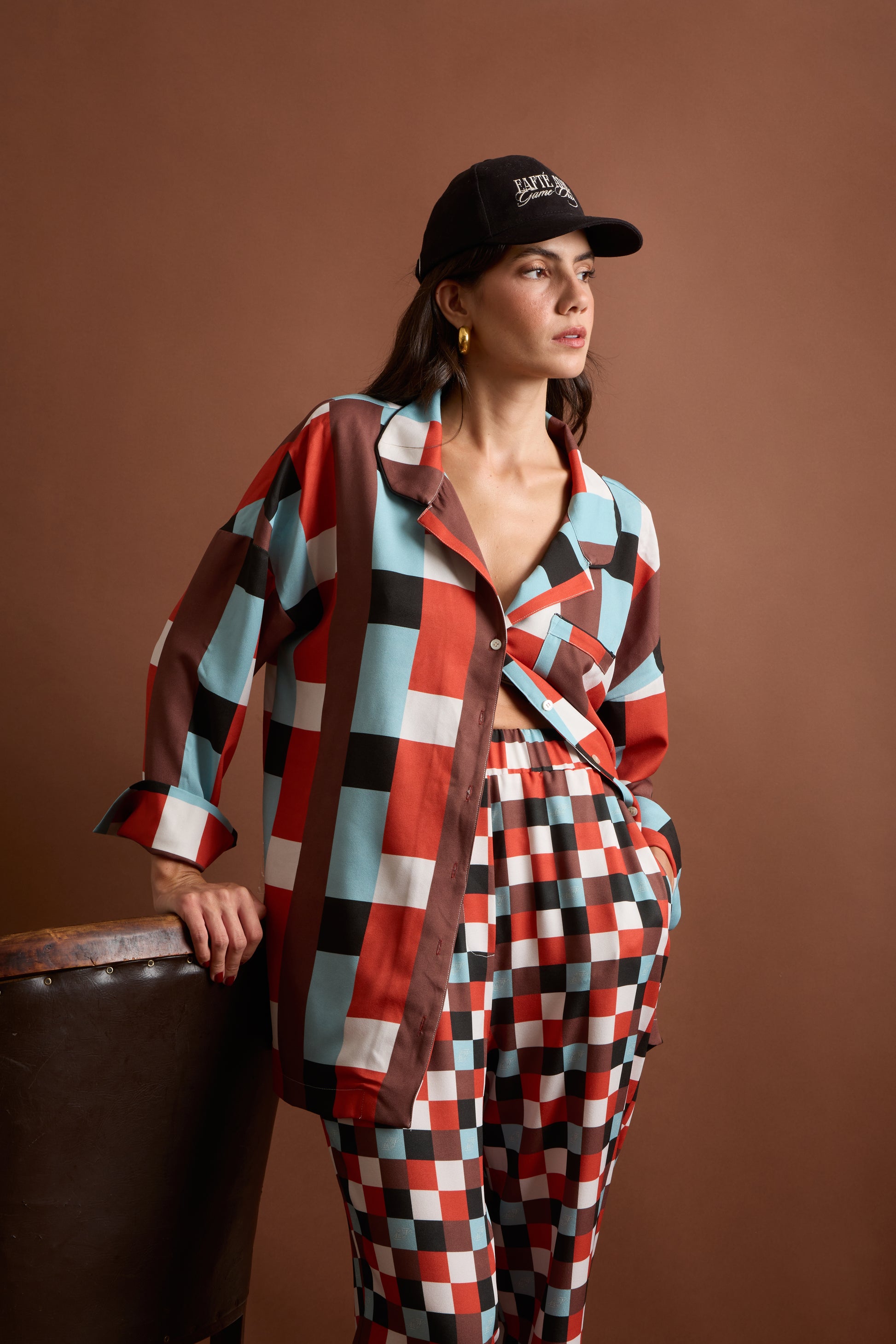 - Bold geometric print in red, blue & chocolate tones